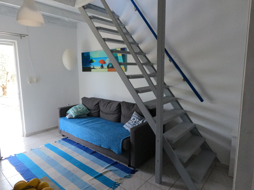 Het huisje is ingericht voor twee tot vier personen. Beneden staat een tweepersoons slaapbank en boven een tweepersoons bed. Een babybedje kan ook geplaatst worden. Lakens en handdoeken zijn aanwezig. Voor het voor- en naseizoen zijn er dekbedden.